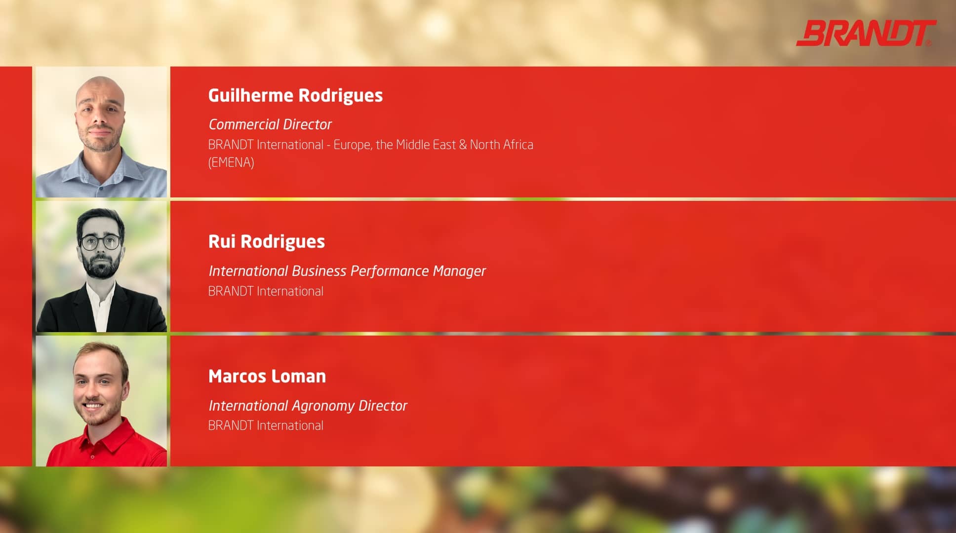 La innovación, la honestidad y el servicio al cliente han conformado nuestros pilares de marca desde 1953 con el nacimiento de BRANDT® hasta la fecha. Nuestro punto de partida para el desarrollo de soluciones eficaces y de calidad para cultivos arbóreos, industriales, hortícolas, céspedes y plantas ornamentales.