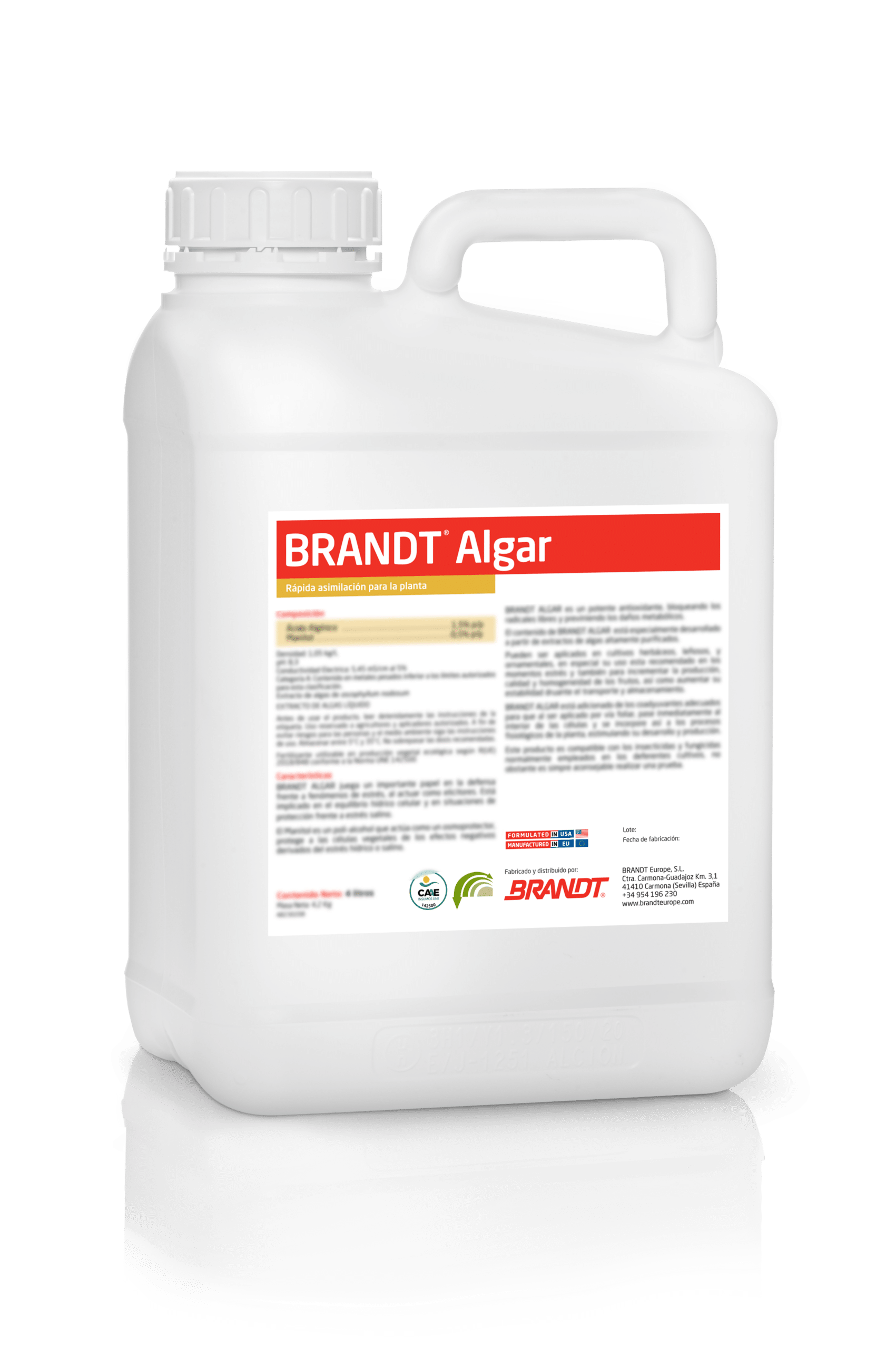 BRANDT® Algar™ est un biostimulant bio composé d'extraits d'algues hautement purifiés. Il est applicable aux cultures arables, ligneuses et ornementales. Son utilisation est recommandée pour protéger la plante lors de certains moments de stress ainsi que pour augmenter la production, la qualité et l'homogénéité des fruits, mais aussi pour améliorer leur stabilité pendant le transport et le stockage.